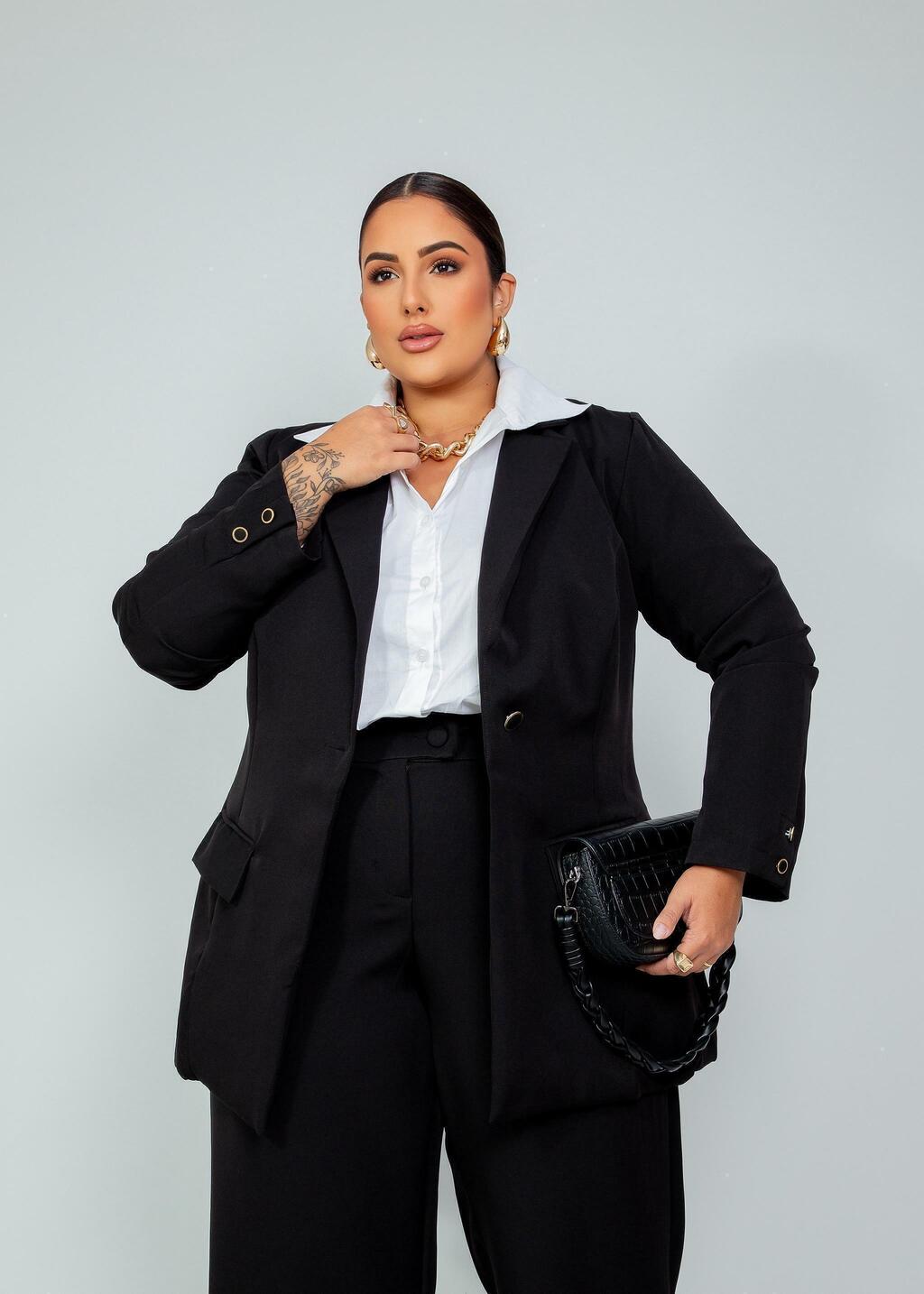Disponível em numeração midsize, com modelagem que respeita e valoriza suas curvas. Blaser forrado e pantalona tem elastano na parte de trás.